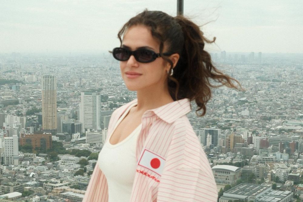Para completar o look, ela apostou em uma regata branca básica com uma camisa de manga curta rosa listrada que possui a bandeira japonesa na lateral. “Me inspirei nos gringos que usam camisa do Brasil pra visitar o Rio, só que versão Japão. É da Cold Culture“, escreveu ela em fotos publicadas no Instagram ao lado de sua prima, Gabi Saiury.